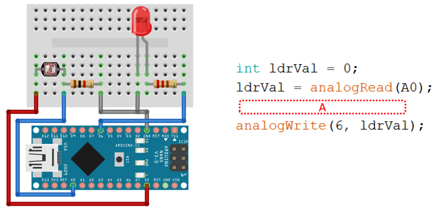 20) Arduino Nano主控板,通过光敏电阻和LED灯模拟当前光照强度的变化。电路搭设及部分程序如下图所示,当光照强度逐渐增强时,LED的亮度随之逐渐增强,此时红框A对应的程序是?( )。