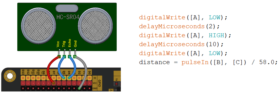 19) Arduino UNO/Nano主控板,读取超声波传感器的返回值,电路搭设和部分程序如下图所示,程序中A/B/C分别是?( )。