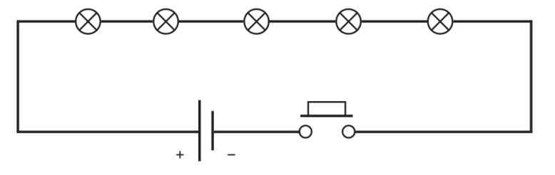 18) 如下图所示,一个串联电路串联了5个灯泡,测得电源旁边的电流为10A,则通过每个灯泡的电流为?