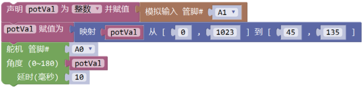 25) Arduino UNO或Nano主控板,通过电位器旋转控制舵机的角度,程序运行下列表达不正确的是?
