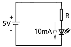 19) 当采用5V电压给LED供电时,需要串联限流电阻。下图电路中,蓝色LED的工作电压为3V,电流为10mA,下列选项中,限流电阻最合理的阻值是 ?( )