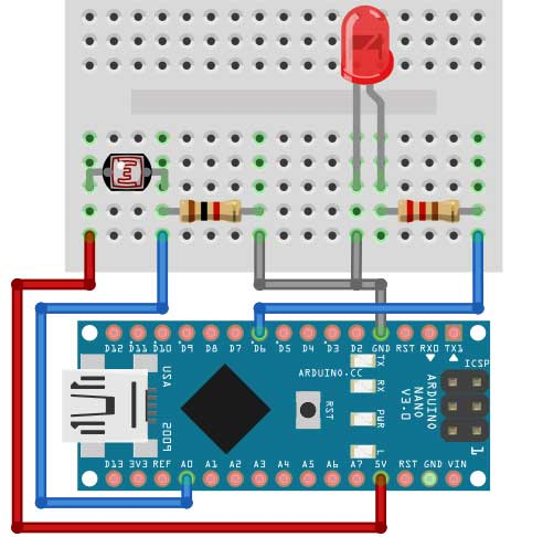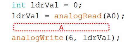 9) Arduino Nano主控板,通过光敏电阻控制LED灯亮度的变化。电路搭设及部分程序如下图所示,当光照强度逐渐增强时,LED的亮度逐渐减弱,此时红框A对应的程序是?( )