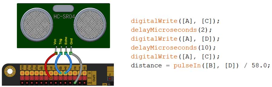 14) Arduino UNO/Nano主控板,读取超声波传感器的返回值,电路搭设和部分程序如下图所示,程序中A/B/C/D分别是?( )