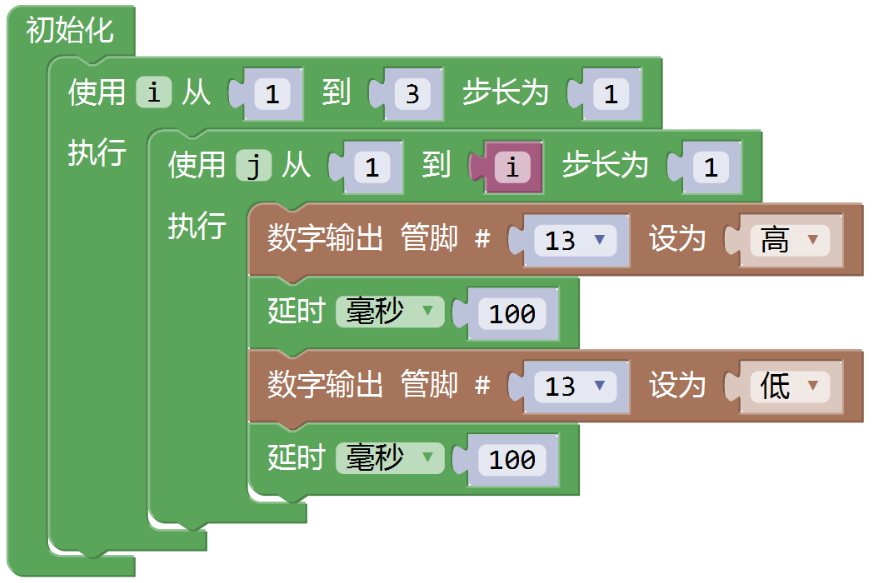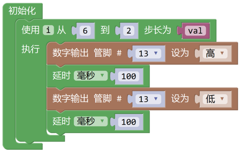 19) Arduino UNO/Nano主控板,下图程序模块控制板载LED灯闪烁2次,程序中变量val的值是?( )。