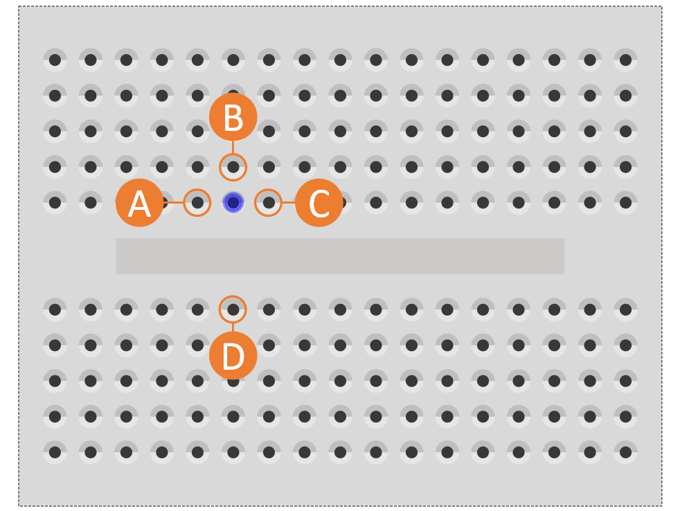 5) 下图面包板所示的四个标注点中,与中间蓝色点连通的是?( )。