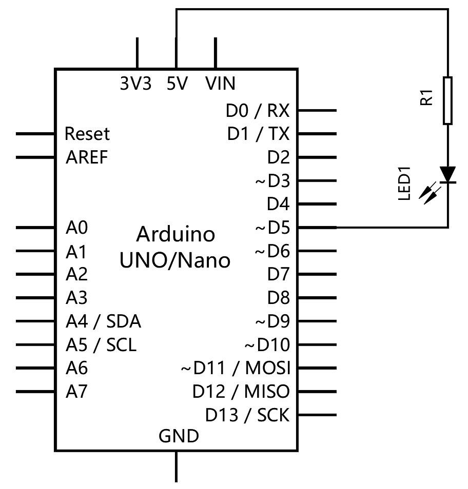 18) Arduino UNO/Nano主控板,电路原理图如下图所示,通过引脚5控制LED灯的状态,下列选项中,控制LED灯点亮的程序模块是?( )。