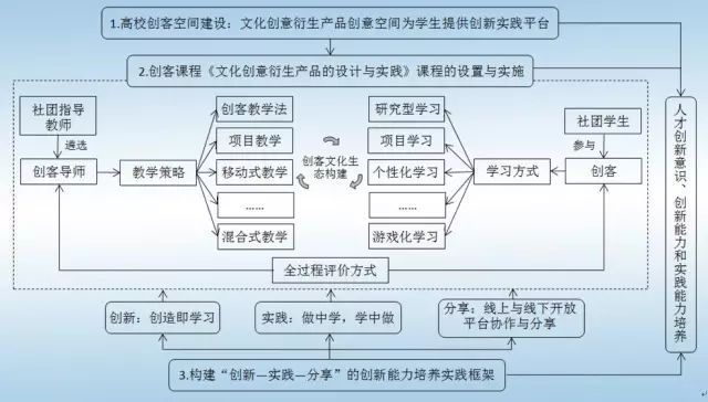 创客教育的终极使命是人才创新意识、创新能力和实践能力的培养,即培育以创客精神为本质的众创文化。诸多高等院校构建了基于社团选修课的创客教育模式,并以社团选修课《文化创意衍生品的设计与实践》课程为例开展创客教育。下图即为基于社团选修课的创客教育模式图。