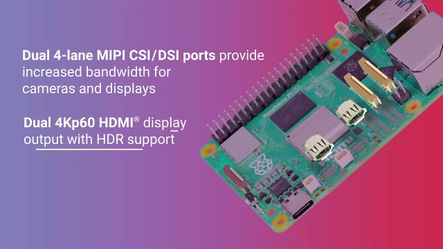 我们更新,更快的 CPU 由更新、更快的 GPU 补充:Broadcom 的 VideoCore VII,在剑桥开发,使用来自 Igalia 朋友的完全开源 Mesa 驱动程序。更新的 VideoCore 硬件视频缩放器(HVS)能够同时驱动两个 4Kp60 HDMI 显示器,高于树莓派4 上的单个 4Kp60 或双 4Kp30。树莓派开发的 4Kp60 HEVC 解码器和新的图像传感器管道(ISP)完善了多媒体子系统。为了保持系统提供内存带宽,我们有一个 32 位 LPDDR4X SDRAM 子系统,运行速度为 4267MT/s,高于树莓派4 的有效 2000MT/s。