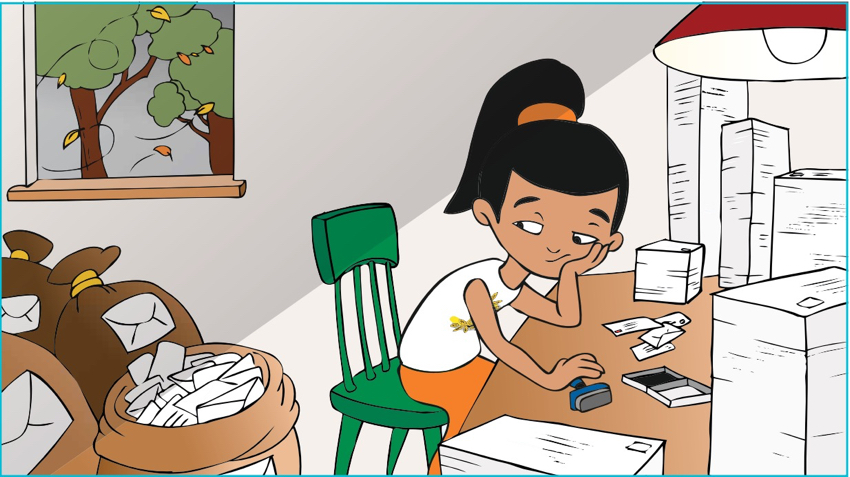 外面风大不适合玩耍,因此吉尔在邮局帮忙给信件盖戳。她的手臂因盖戳而越来越痛,她很累,希望有一种方法能够利用风来帮她盖戳!