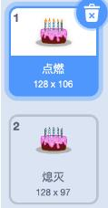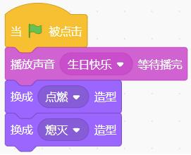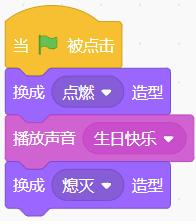 蛋糕的造型如下图所示,下列哪个选项能够实现,每次点击绿旗,蜡烛先是点燃的,播放完”生日快乐“音乐后,蜡烛熄灭?( )。
