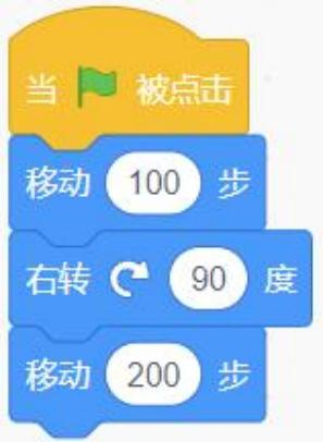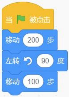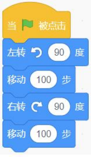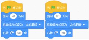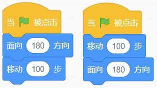 默认小猫角色,初始位置在舞台中央,初始方向为水平向右,分别运行下列两个程序后,舞台上显示的效果是一样的。( )。
