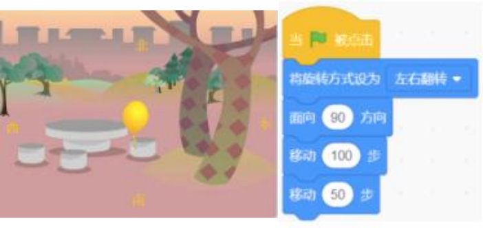 1) 气球初始位置如下图所示,运行下列程序,气球会朝哪个方向移动?( )。