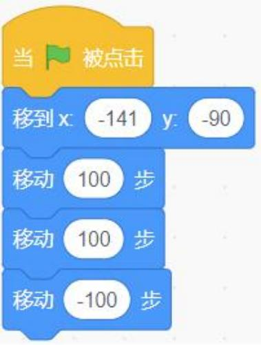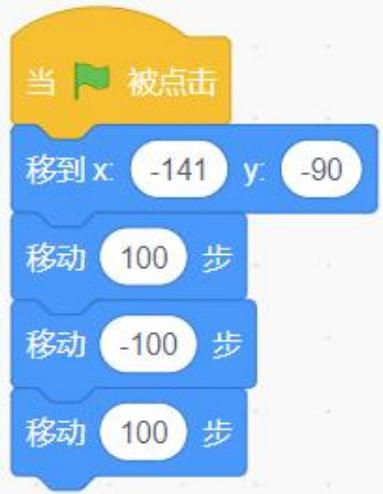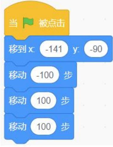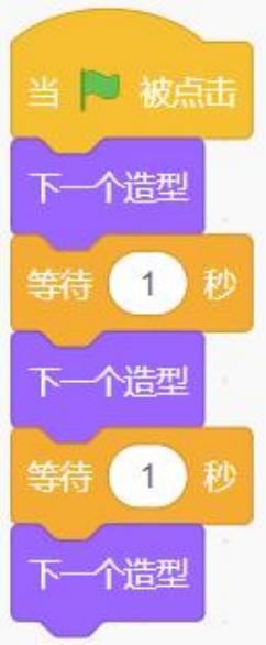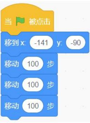 (2)等待 1 秒后,小猫每隔 0.5 秒,水平向右,移动 30,切换一次造型,这样移动四次后,到达足球边上。