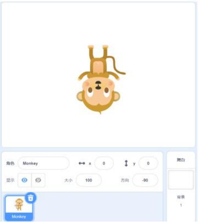 4) 小猴子的默认旋转方式为“任意旋转 ”,下列哪个积木能让小猴子从左图变为 右图,表演倒立?( )。