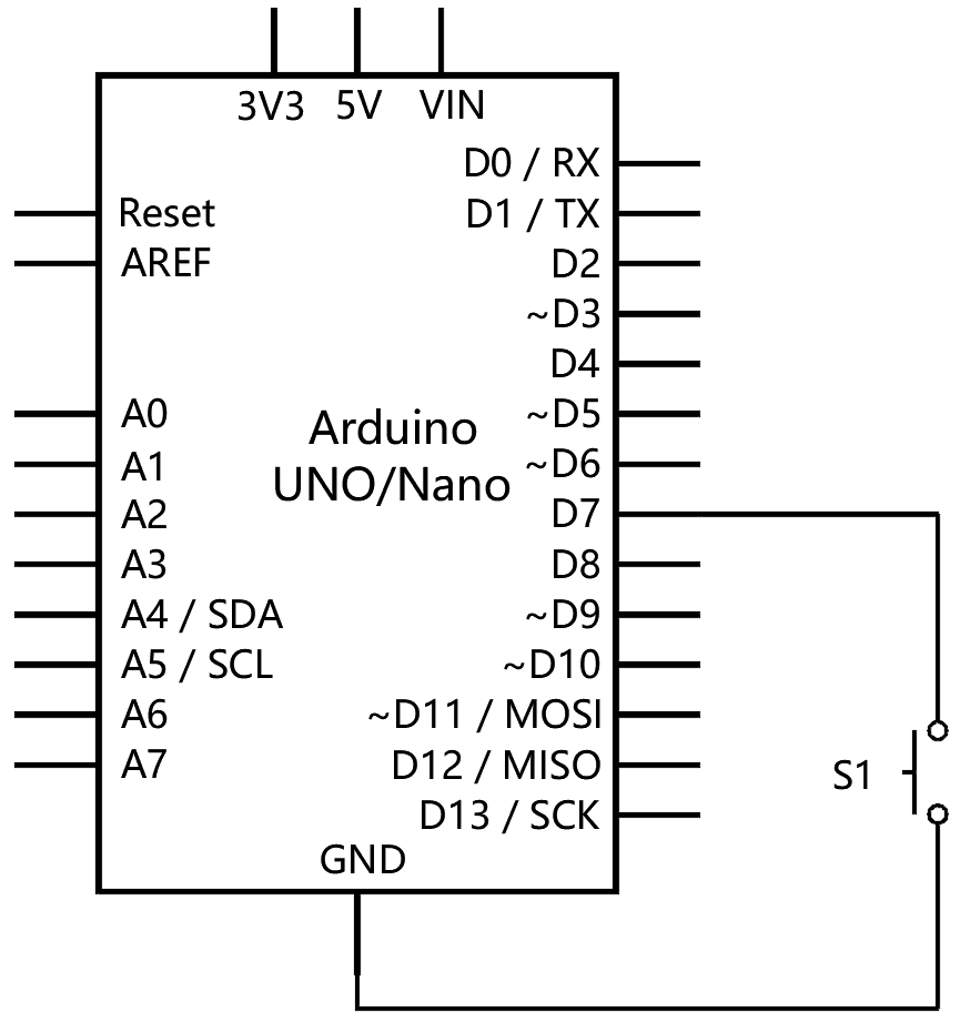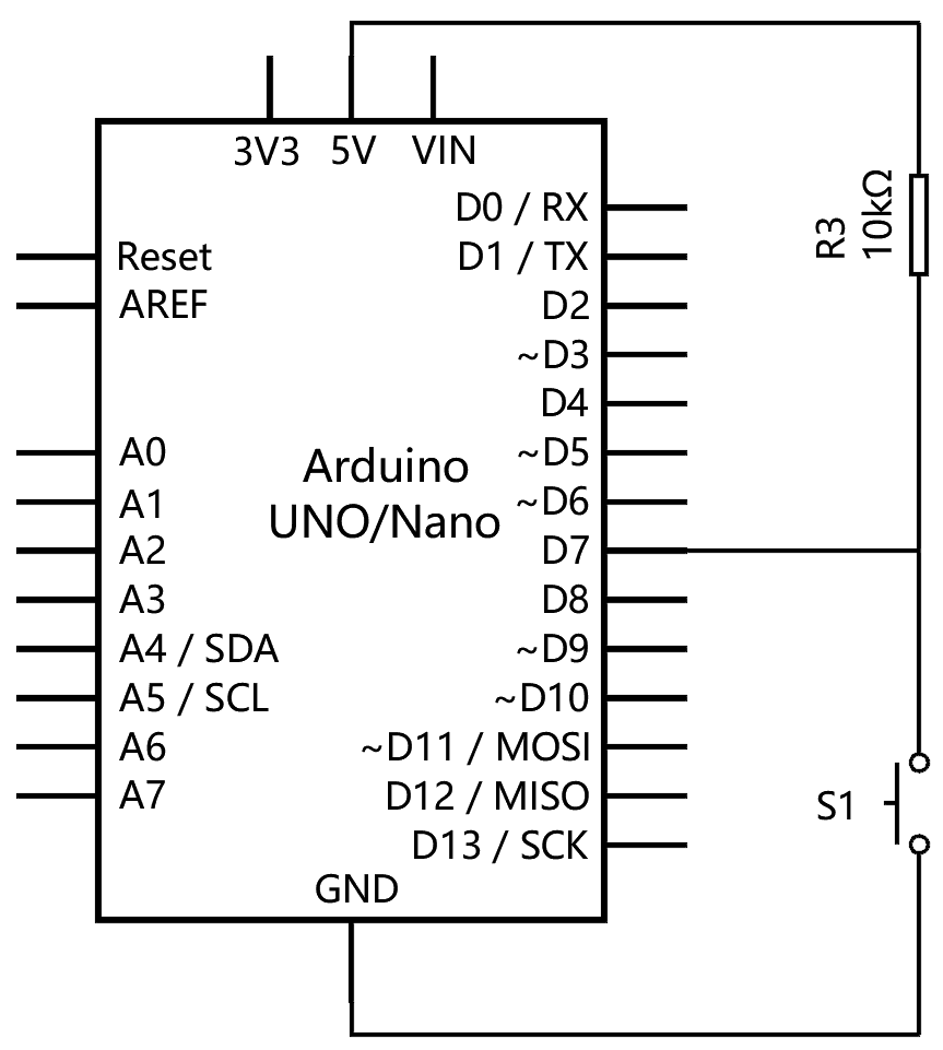 10) Arduino UNO/Nano主控板,电路如下图所示,通过7引脚获取按键的返回值,下列选项中,关于电路描述正确的是?( )