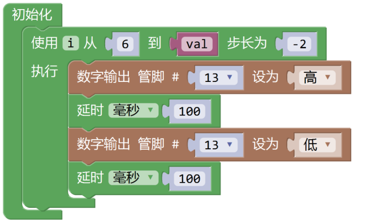 19) Arduino UNO/Nano主控板,下图程序模块控制板载LED灯闪烁3次,程序中变量val的值是?( )