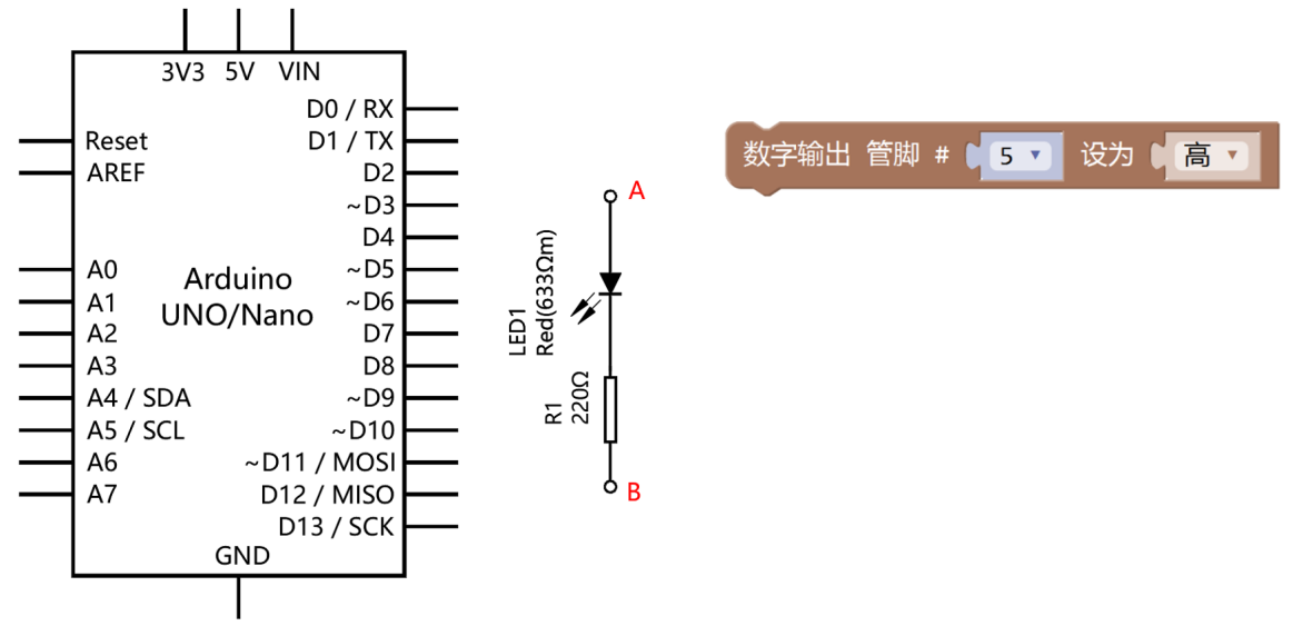18) Arduino UNO/Nano主控板,通过引脚5控制LED灯的状态,程序和部分电路原理图如下,下列选项中,LED灯点亮所对应的电路连接是?( )