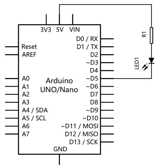 20) Arduino UNO/Nano主控板,电路原理图和程序如下图所示,通过引脚5控制LED灯的状态,下列选项中,LED灯点亮所对应的程序模块是?( )