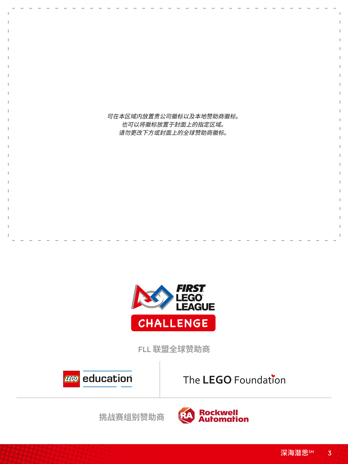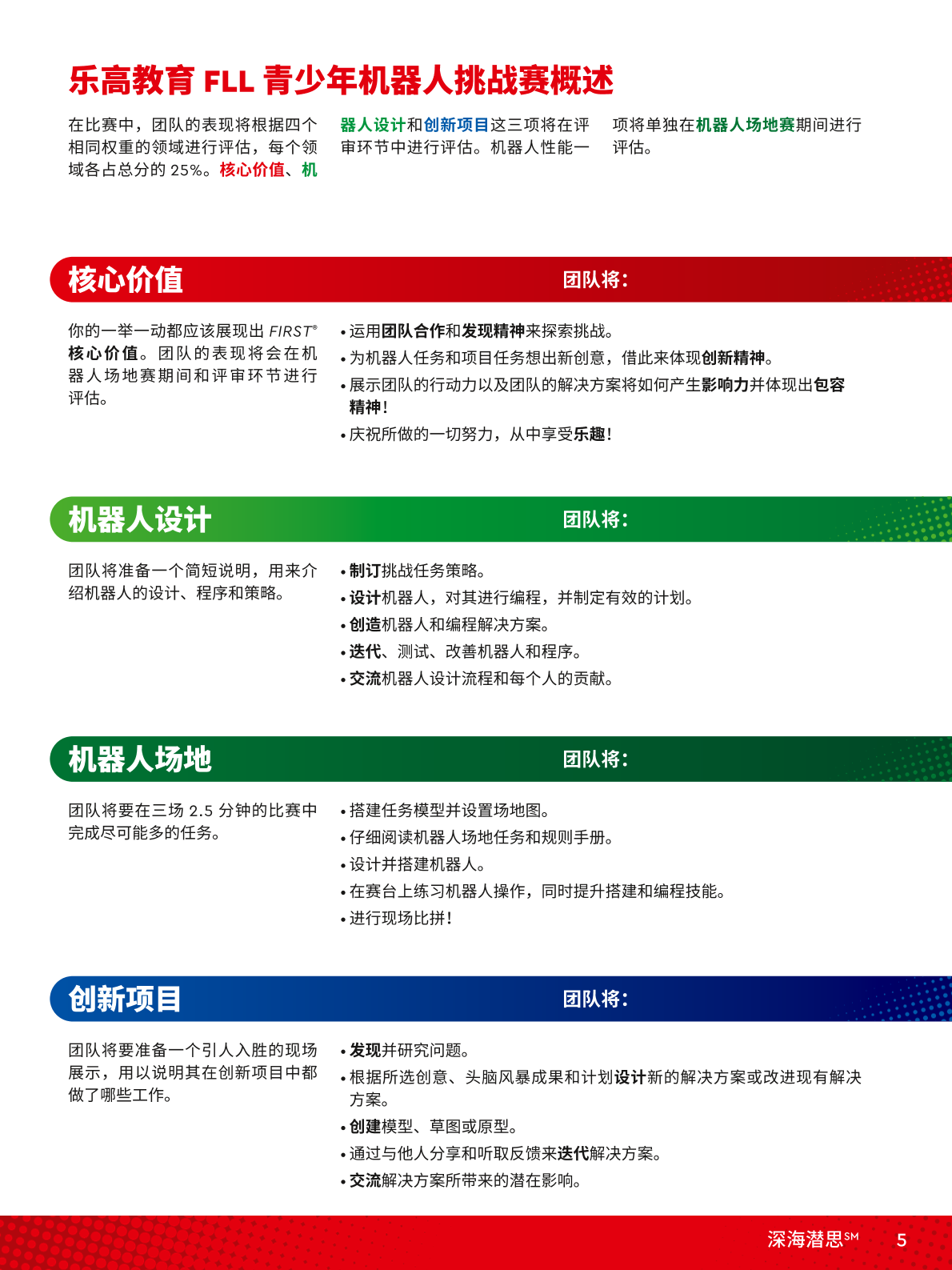 本年度的机器人场地赛将带你们经历一场惊心动魄的冒险,体验海洋中不同层带的栖息地。准备好潜入海底世界吧。从阳光带开始,你的团队要修复珊瑚礁、从一艘沉船上打捞文物、探索神秘的冷泉等。准备好踏上难忘的探索之旅吧!
