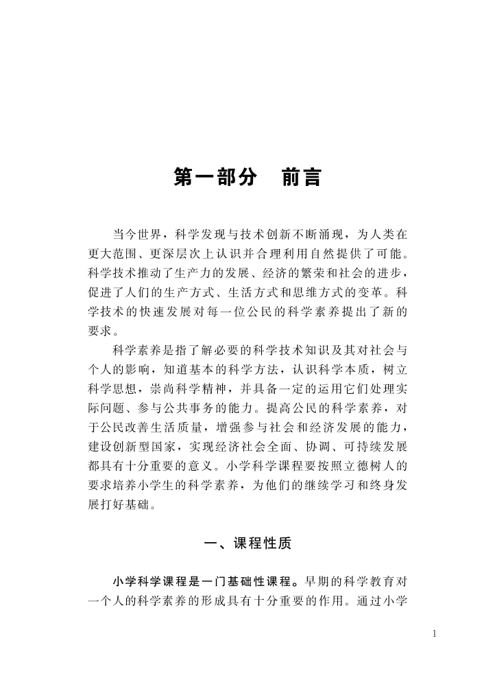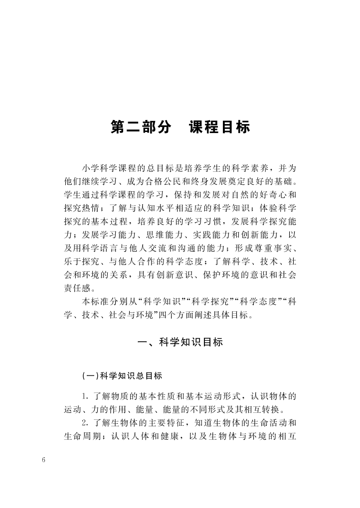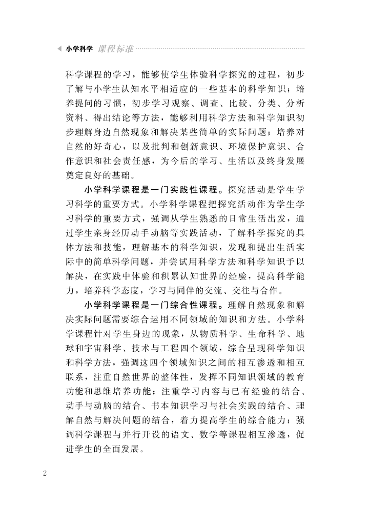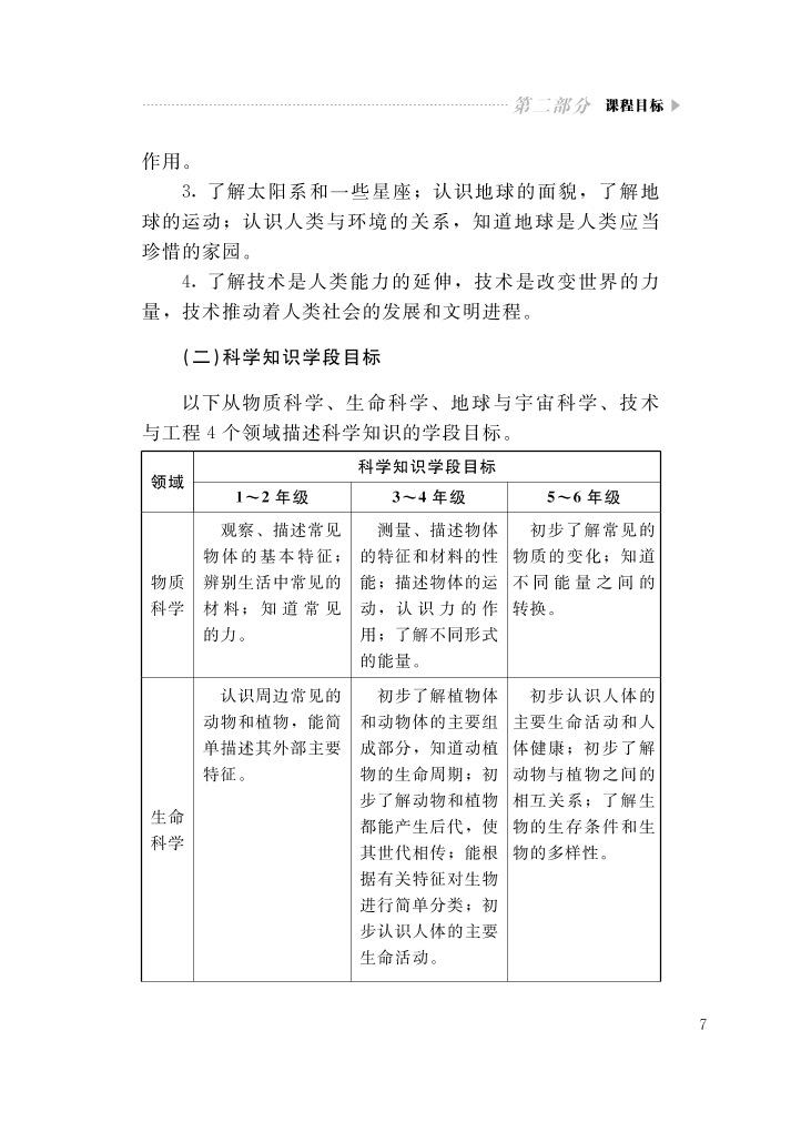 小学科学课程内容以学生能够感知的物质科学、生命科学、地球与宇宙科学、技术与工程中一些比较直观、学生有兴趣参与学习的重要内容为载体,重在培养学生对科学的兴趣、正确的思维方式和学习习惯。本标准在物质科学领域选择了6个主要概念,生命科学领域选择了6个主要概念,地球与宇宙科学领域选择了3个主要概念,技术与工程领域选择了3个主要概念,四大领域的18个主要概念构成了本课程的学习内容,并将科学、技术、社会与环境的内容融入其中。这四大领域的18个主要概念被分解成75个学习内容,分布在三个学段的课程内容中。