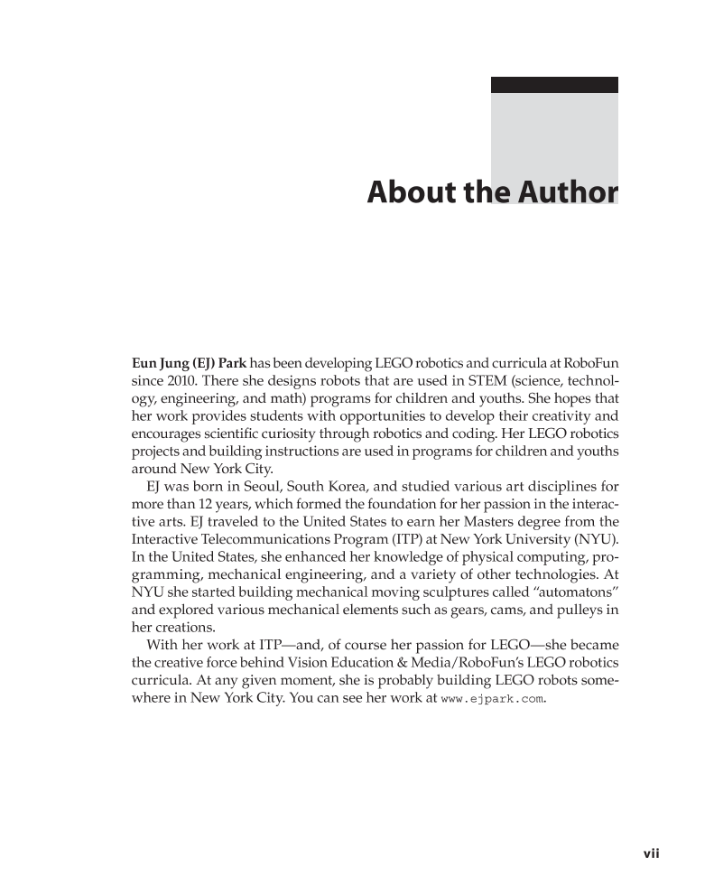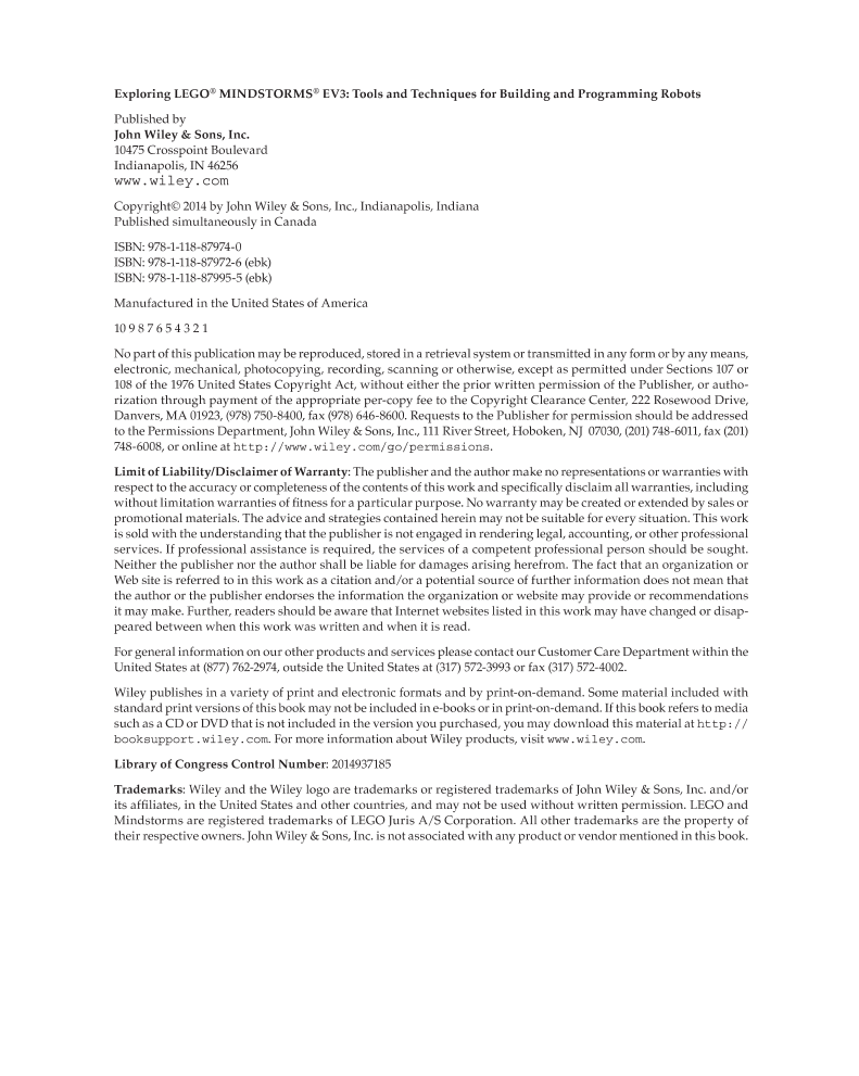 This book starts by introducing the parts that you will see when you open the EV3 box, and it ends with suggestions on how to begin your own robot. In between, the book covers a wide range of programming from basic to advanced. These lessons go along with projects that you can build with your own EV3 set. There will be a total of fi ve robots that I hope will encourage you to challenge yourself to become a better maker throughout your EV3 journey.