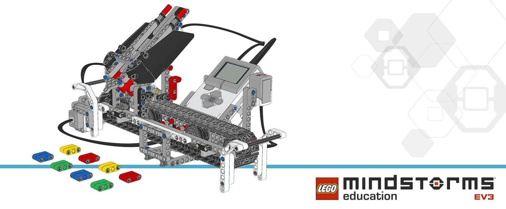 Colour Sorter (颜色分拣机) 装置包括一个颜色传感器color sensor用于颜色识别,一个大型电机large motor带动履带的转动,一个触碰传感器touch sensor用于感知触碰,以及一个中型电机medium motor用于把乐高色块弹出去。