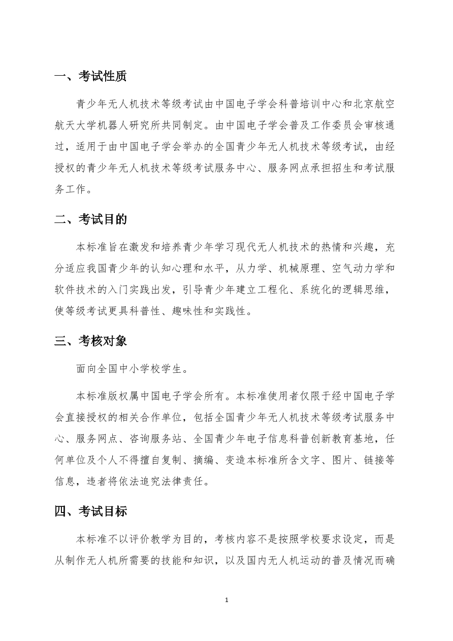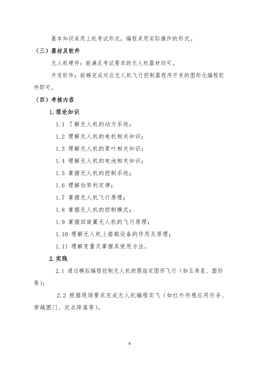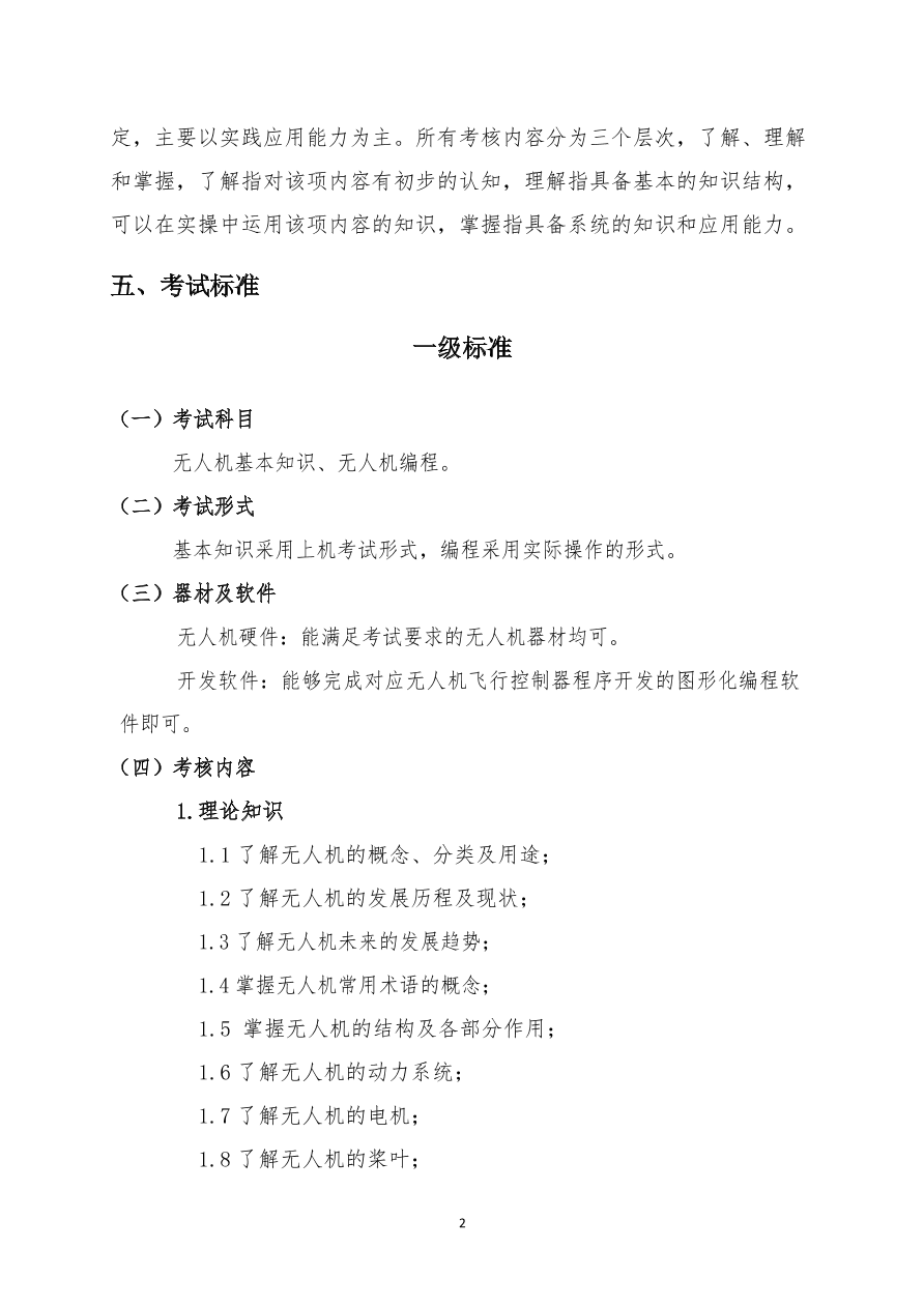 本标准不以评价教学为目的,考核内容不是按照学校要求设定,而是从制作无人机所需要的技能和知识,以及国内无人机运动的普及情况而确定,主要以实践应用能力为主。所有考核内容分为三个层次,了解、理解和掌握,了解指对该项内容有初步的认知,理解指具备基本的知识结构,可以在实操中运用该项内容的知识,掌握指具备系统的知识和应用能力。