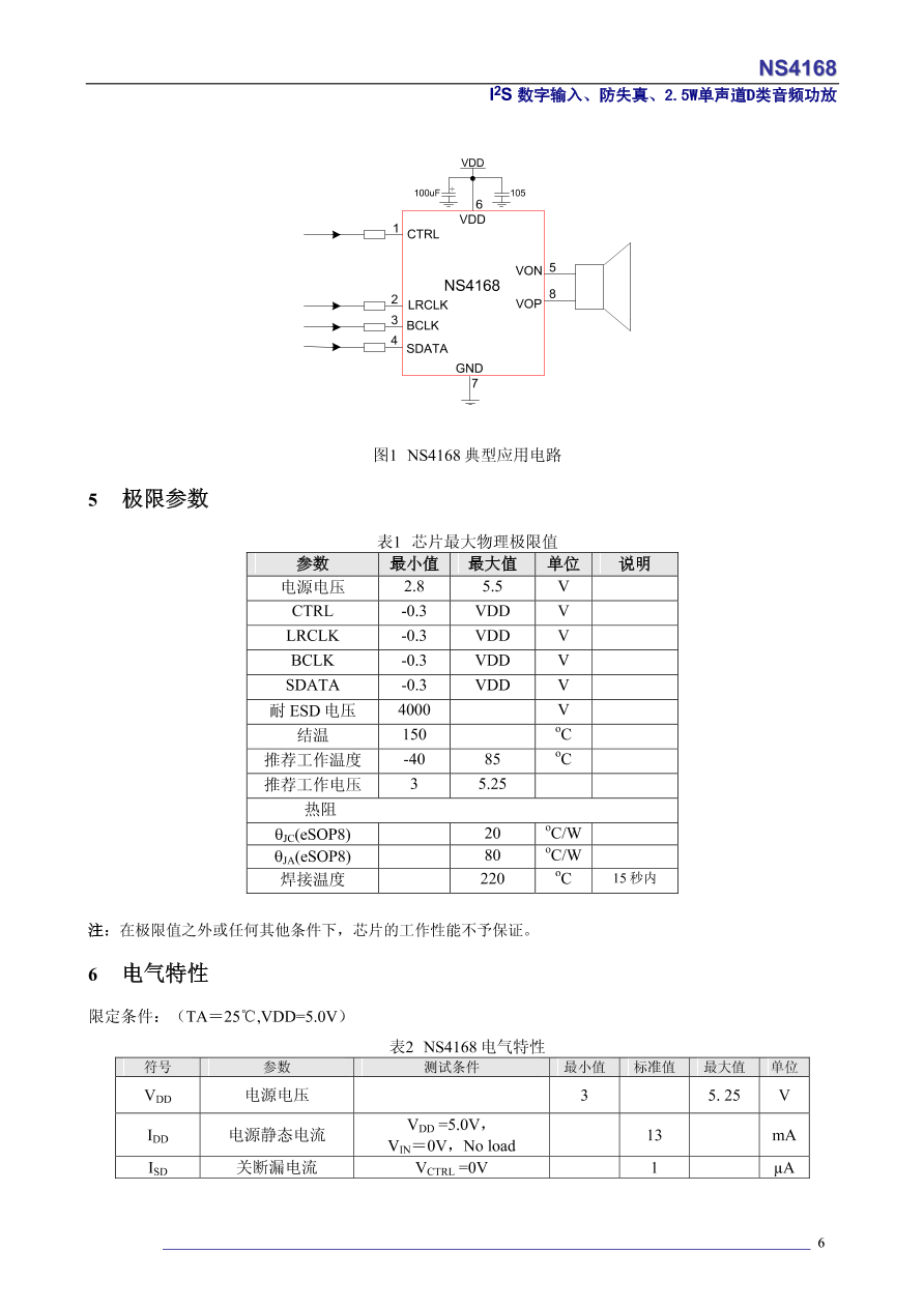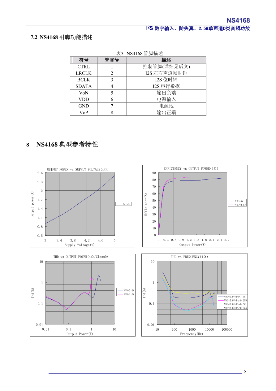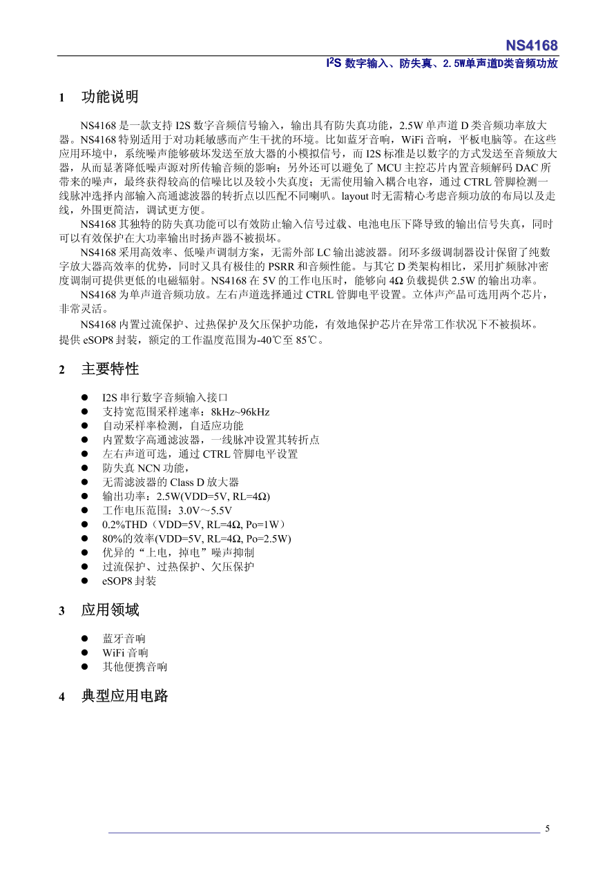 NS4168 内置过流保护、过热保护及欠压保护功能,有效地保护芯片在异常工作状况下不被损坏。提供 eSOP8 封装,额定的工作温度范围为-40℃至 85℃。
