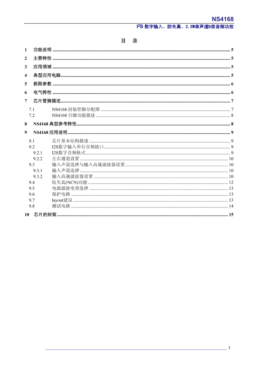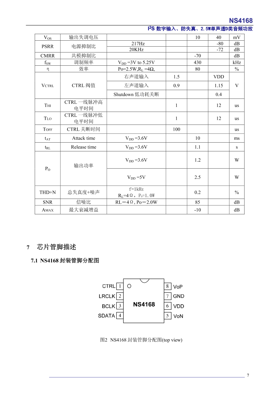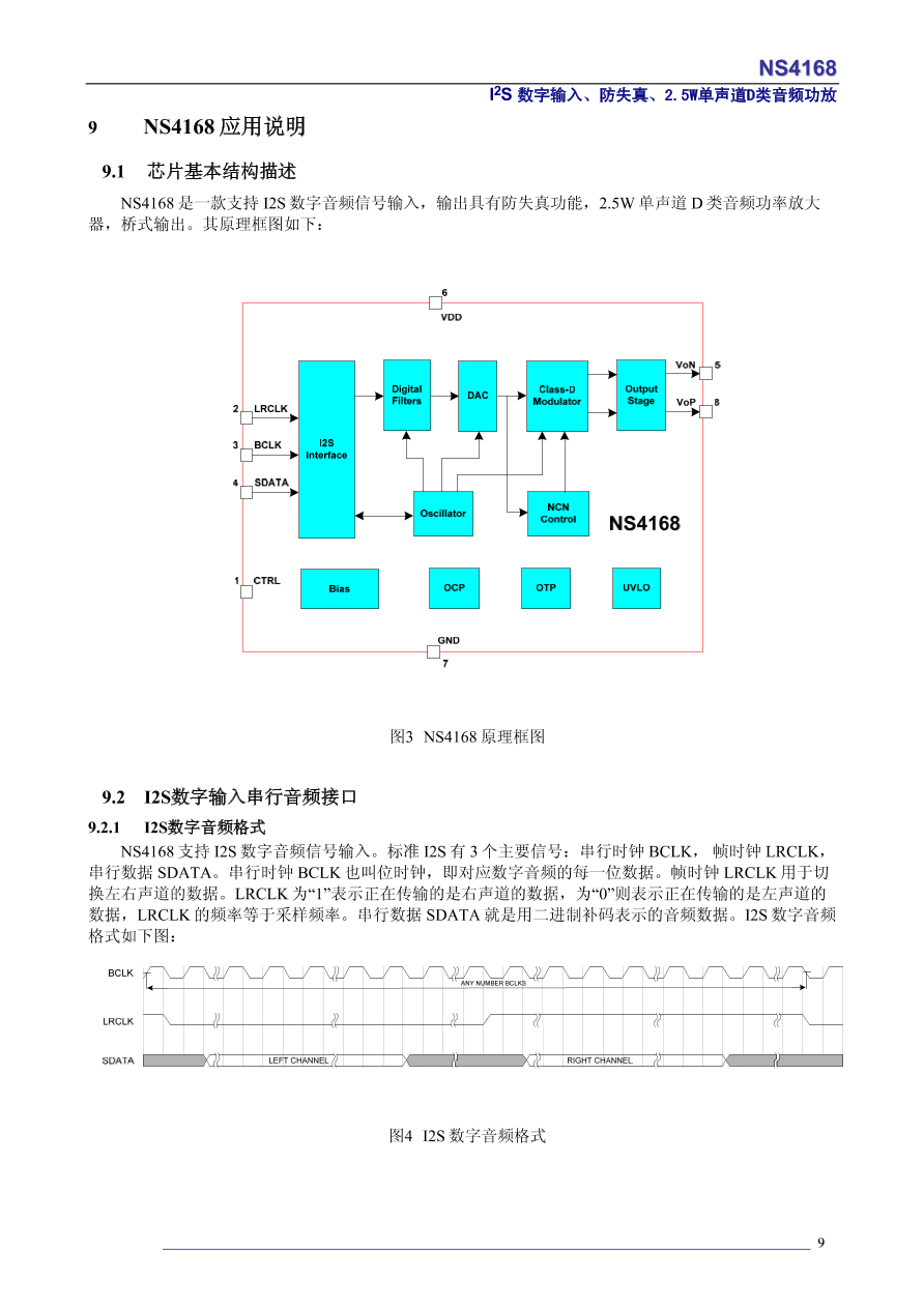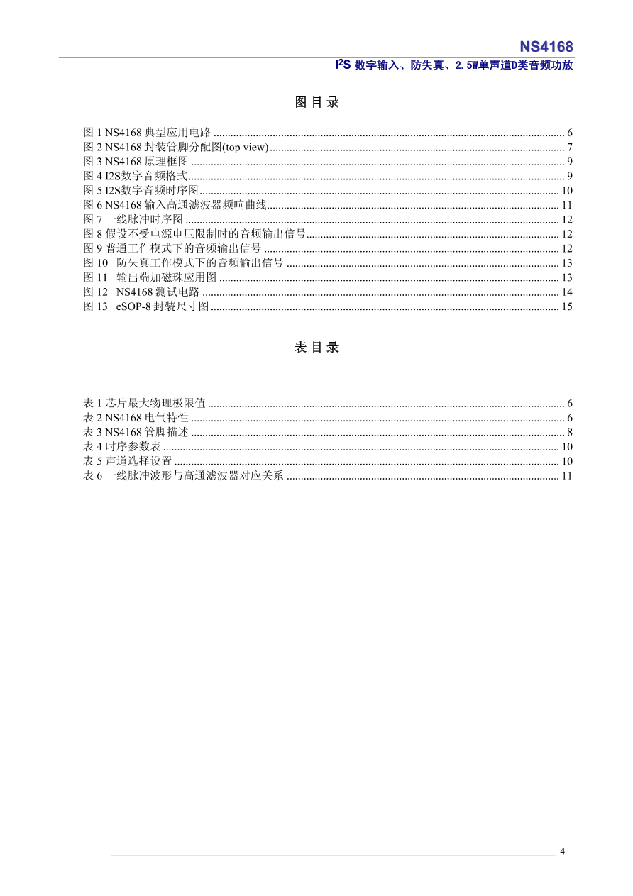NS4168 内置过流保护、过热保护及欠压保护功能,有效地保护芯片在异常工作状况下不被损坏。提供 eSOP8 封装,额定的工作温度范围为-40℃至 85℃。