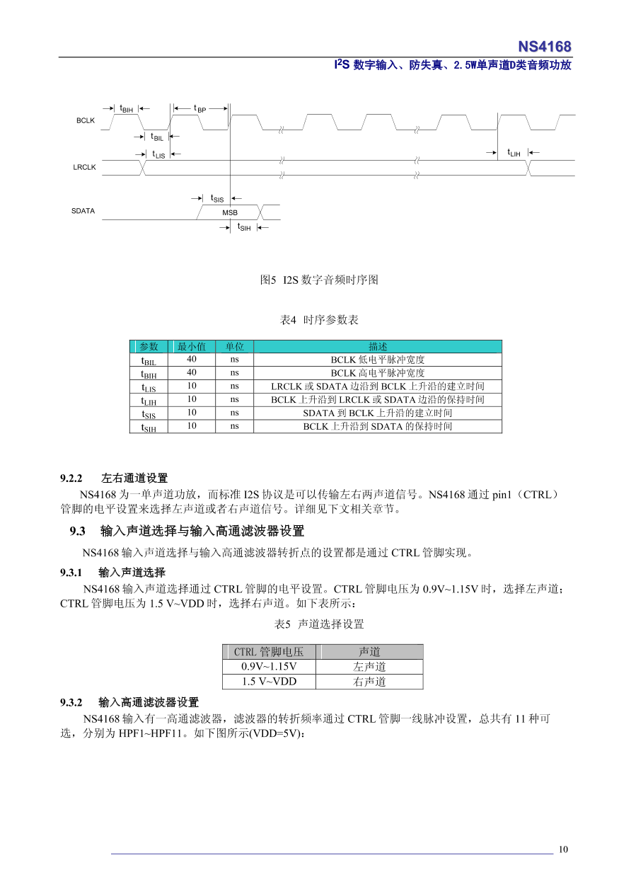 NS4168 为单声道音频功放。左右声道选择通过 CTRL 管脚电平设置。立体声产品可选用两个芯片,非常灵活。