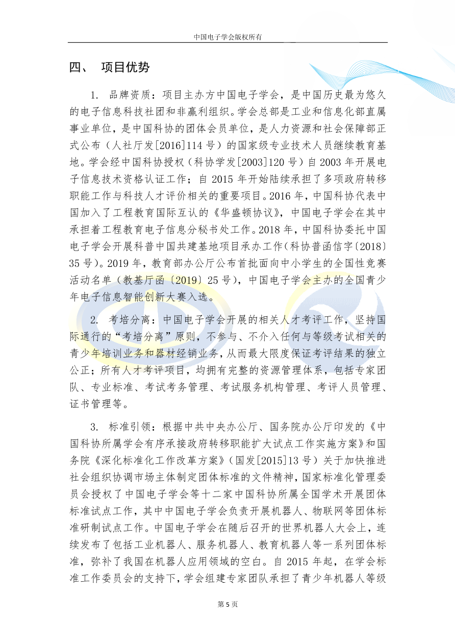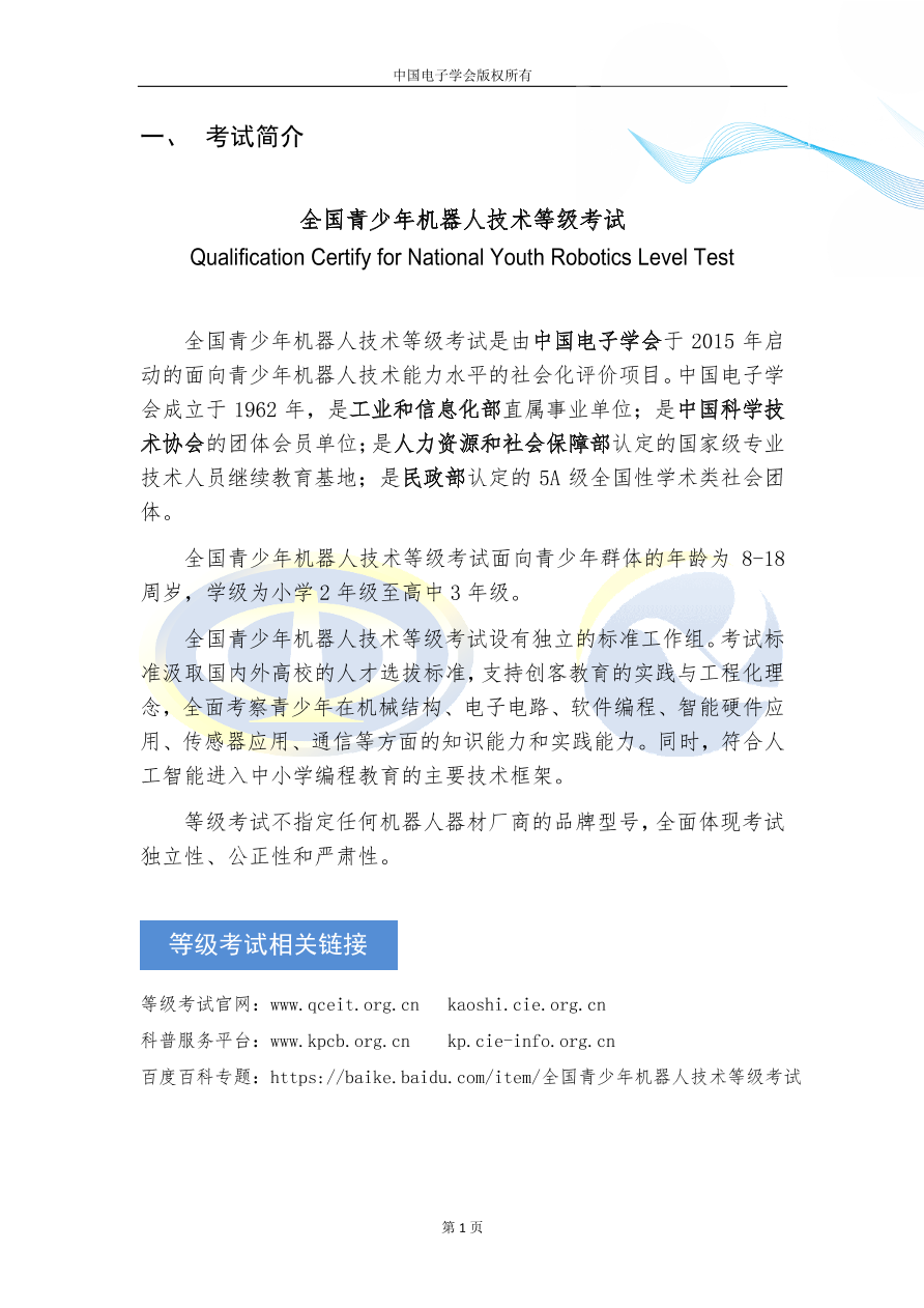 中国电子学会等级考试具有独立的标准组、命题组和人机结合的监考体系;坚持国际通行的“”原则,不参与考生培训、器材和软件业务,保证考评独立公正。