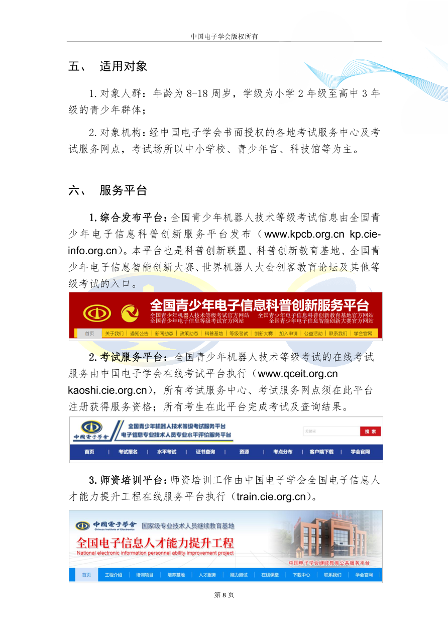 全国青少年机器人技术等级考试面向青少年群体的年龄为 8-18周岁,学级为小学 2 年级至高中 3 年级。