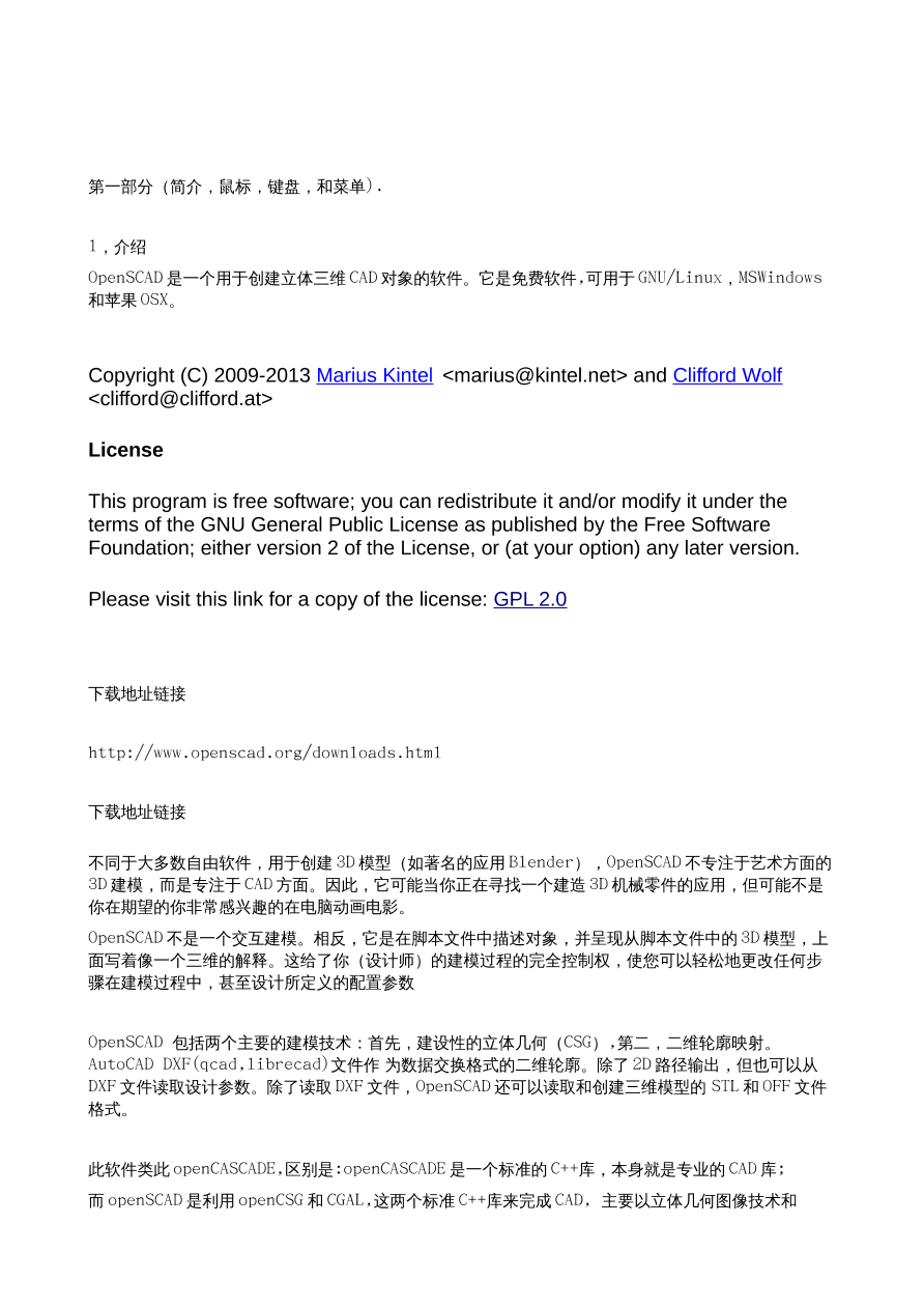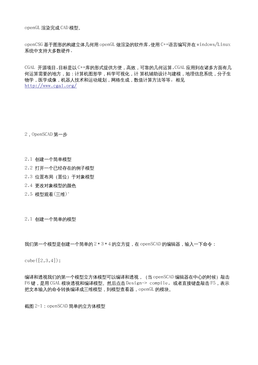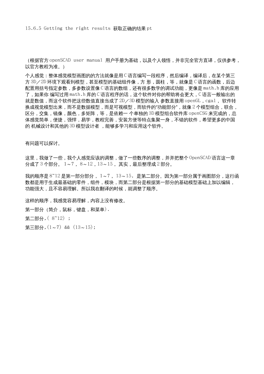 个人感觉:整体感觉模型画图的的方法就像是用 C 语言编写一段程序,然后编译,编译后,在某个第三方 3D/2D 环境下观看到模型,甚至模型的基础组件像,方 形,圆柱,等,就像是 C 语言的函数,后边配置用括号指定参数,多参数设置像 C 语言的数组,还有很多数学的调试功能,更像是 math.h 库的应用了,如果你编写过用 math.h 库的 C 语言程序的话,这个软件对你的帮助将会更大,C 语言一般输出的就是数值,而这个软件把这些数值直接当成了 2D/3D 模型的输入 参数直接用 openGL,cgal, 软件转换成视觉模型出来,而不是数据模型,而是可视模型,而软件的“功能部分”,就像 2 个模型组合,联合,区分,交集,镜像,颜色,多矩阵,等,是依赖一 个单独的 3D 模型组合软件库 openCSG 来完成的,总体感觉简单,便捷,强悍,易学,教程完善,安装方便等特点集聚一身,不错的软件,希望更多的中国的机械设计和其他的 3D 模型设计者 ,能够多学习和应用这个软件。