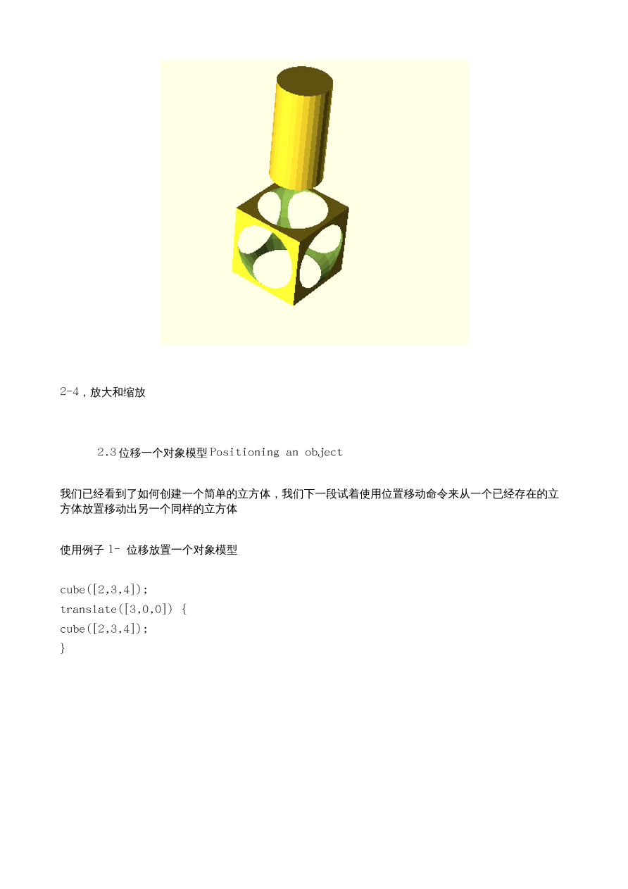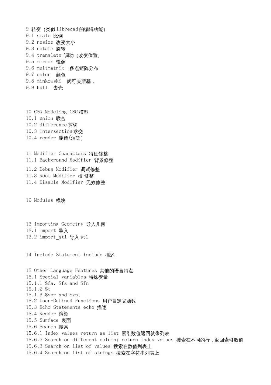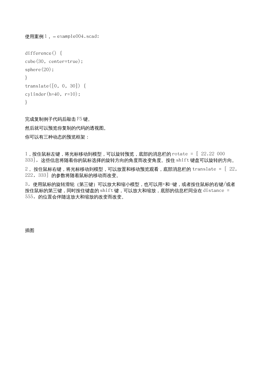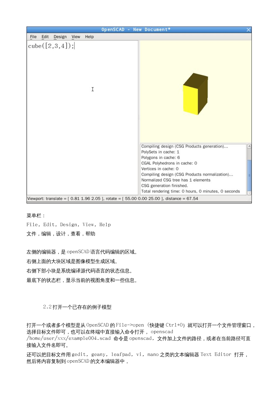 个人感觉:整体感觉模型画图的的方法就像是用 C 语言编写一段程序,然后编译,编译后,在某个第三方 3D/2D 环境下观看到模型,甚至模型的基础组件像,方 形,圆柱,等,就像是 C 语言的函数,后边配置用括号指定参数,多参数设置像 C 语言的数组,还有很多数学的调试功能,更像是 math.h 库的应用了,如果你编写过用 math.h 库的 C 语言程序的话,这个软件对你的帮助将会更大,C 语言一般输出的就是数值,而这个软件把这些数值直接当成了 2D/3D 模型的输入 参数直接用 openGL,cgal, 软件转换成视觉模型出来,而不是数据模型,而是可视模型,而软件的“功能部分”,就像 2 个模型组合,联合,区分,交集,镜像,颜色,多矩阵,等,是依赖一 个单独的 3D 模型组合软件库 openCSG 来完成的,总体感觉简单,便捷,强悍,易学,教程完善,安装方便等特点集聚一身,不错的软件,希望更多的中国的机械设计和其他的 3D 模型设计者 ,能够多学习和应用这个软件。