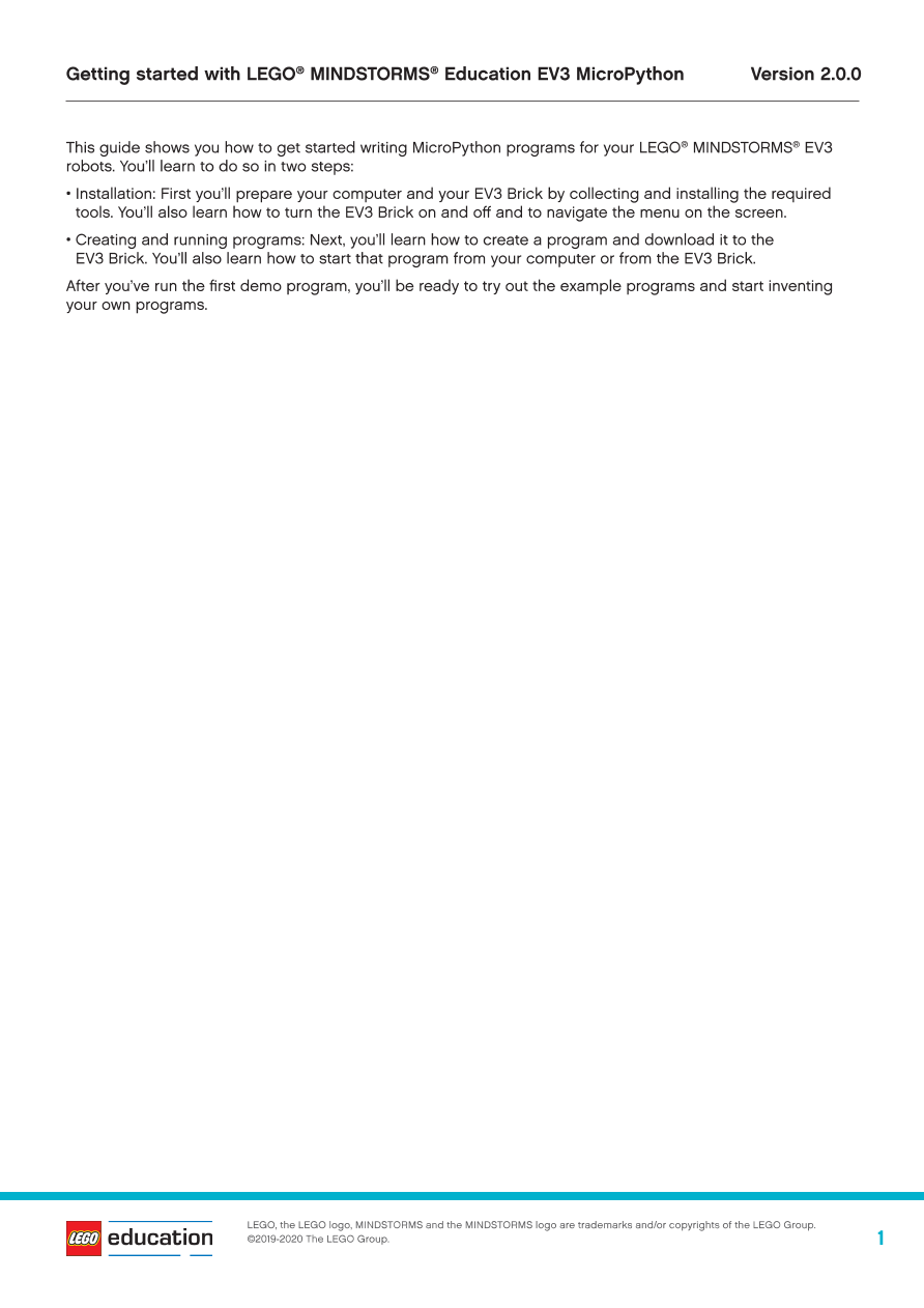 本指南介绍了如何开始为乐高®教育MINDSTORMS®头脑风暴EV3机器人编写MicroPython程序。