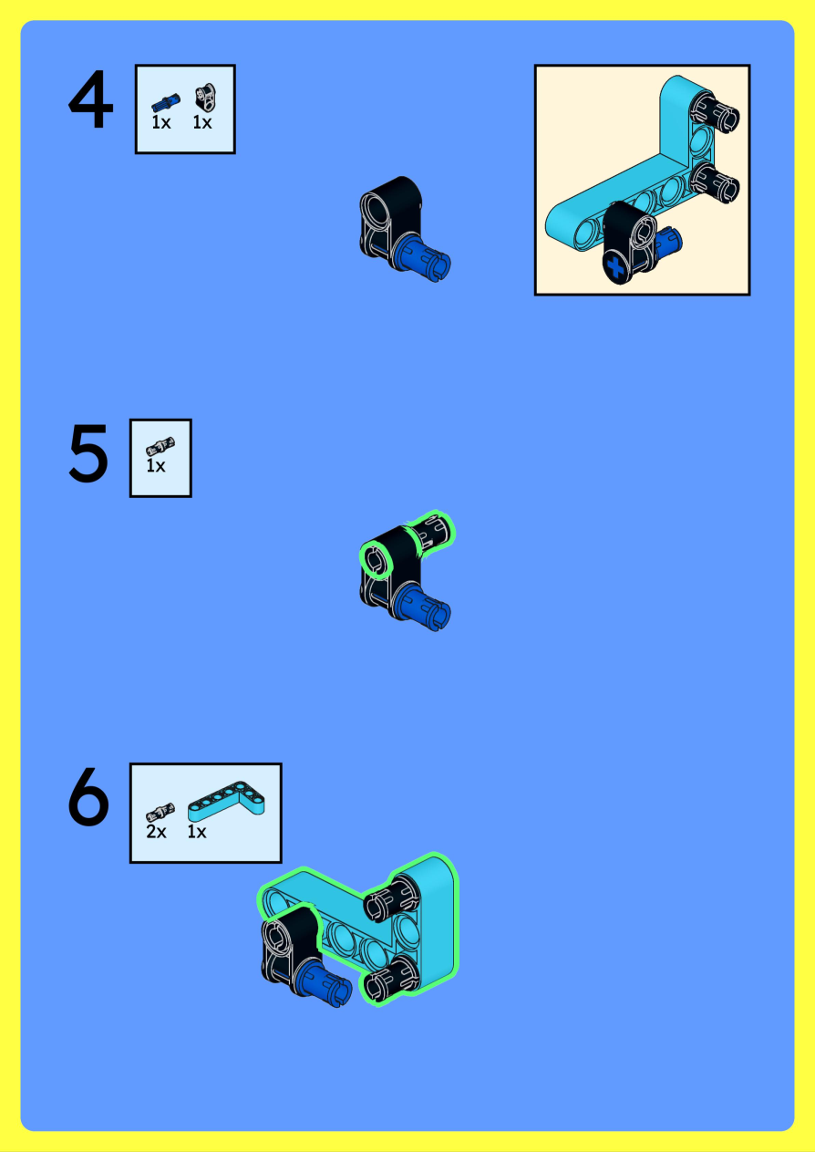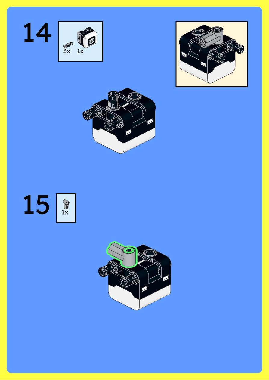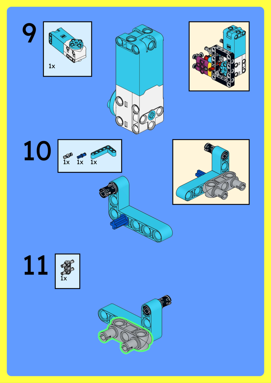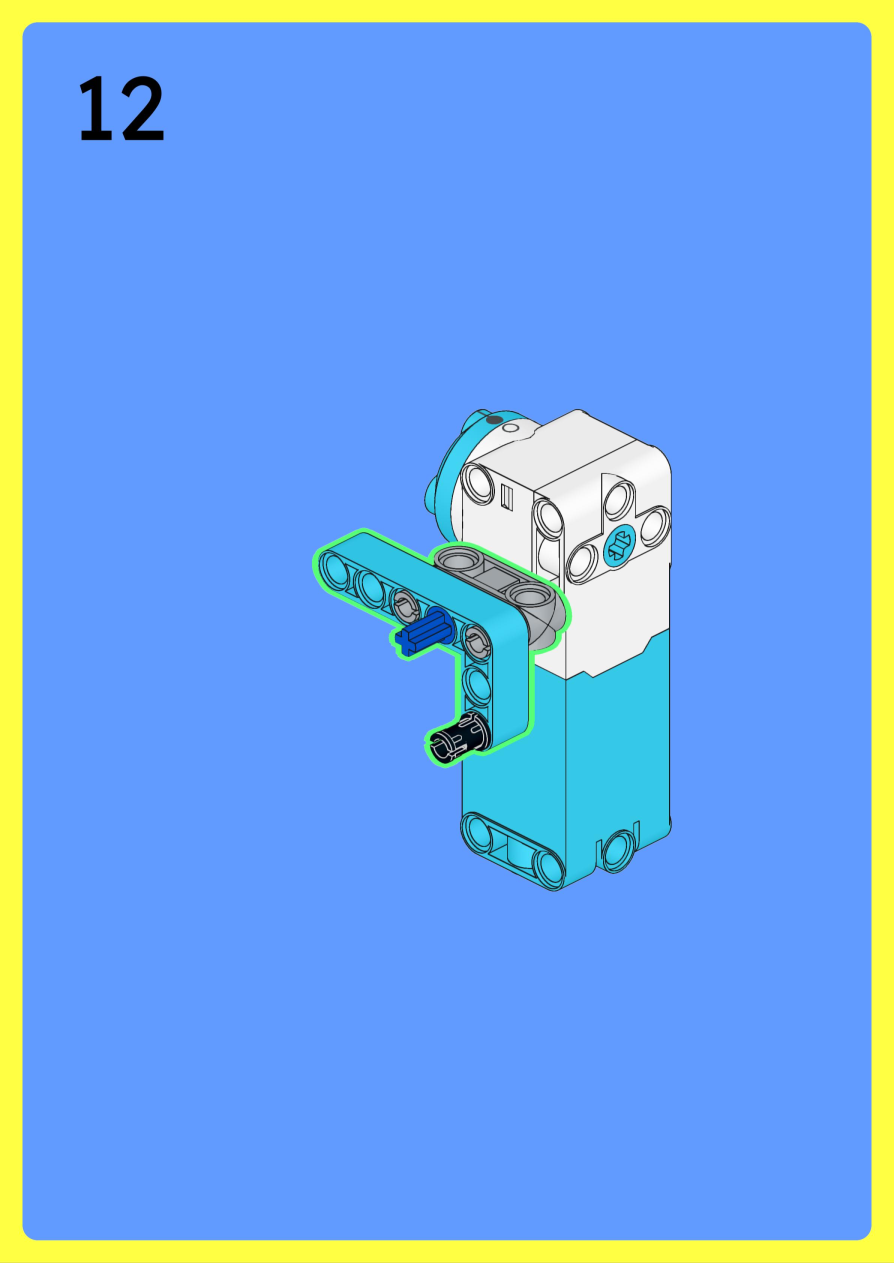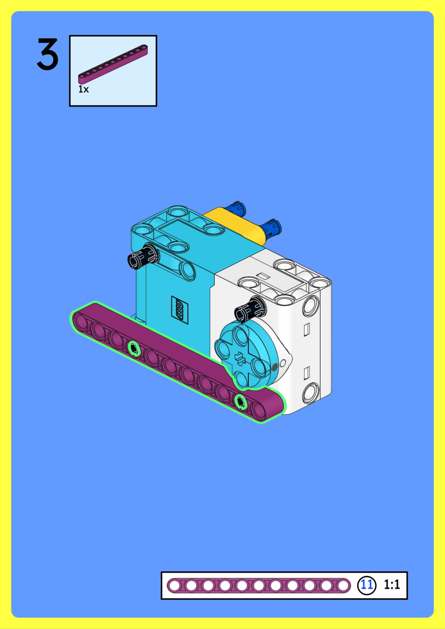 这是单套件机器人设计,仅使用一个教育版 EV3 核心套件,并添加了一个颜色传感器。 前面的绿色 3M 横梁可以升起,是一个锁定机构,用于将附件固定到位。提供一些基本的附件设计。