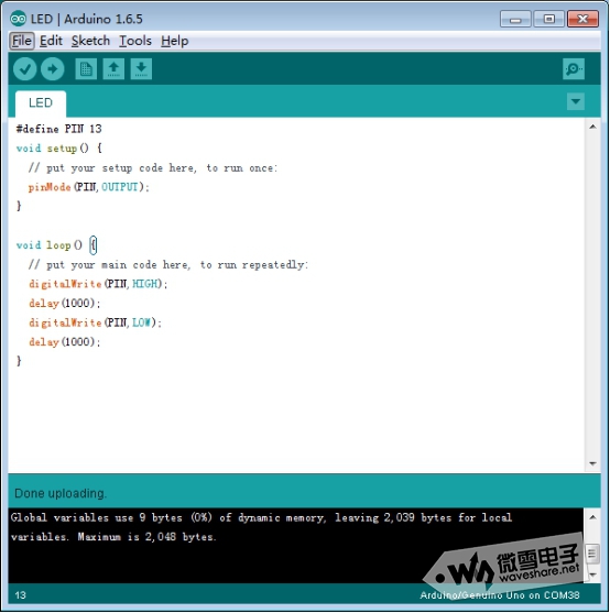 在UNO PLUS中,D13号引脚通过1个1k电阻与LED相连,LED另一端接入地回路,所以要点亮LED,只需让D13输出高电平即可;反之就输出低电平;