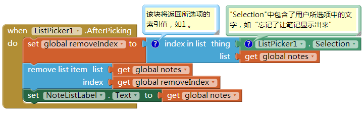 但是想到“remove item from list”块需要的是索引值(列表中的位置),不是具体的项,而Selection属性却是实际数据(一条笔记),不是索引值,ListPicker组件不直接提供对列表索引值的访问(在App Inventor的后续版本中将添加此功能)。