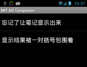 可惜这种简单的显示方法看起来不够美观,列表中所有的项被放置在一对小括号内,没有分行,项之间用空格分隔。如图19-18所示,用户输入了第一条笔记“忘记了让笔记显示出来”,然后又输入第二条“显示结果被一对括号包围着!”。