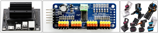 网上大部分提到的 PCA9685 控制板,指的是下图中间这种 16 路 PWM 舵机驱动板,左边的接脚与 Jetson Nano 2GB 的 I2C 与电源的引脚相连,下面有编号 0~15 总共 16 组引脚可以接上右边的各种舵机。控制板中间可以看到 “PWM/V+/GND” 的印刷字样,上方白色电源孔接到独立供电系统,这样就能轻松地组合多机械手臂的应用。