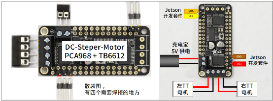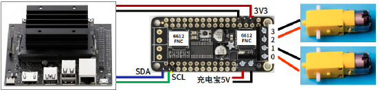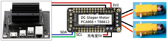 在 Jetbot 项目中只需要用到 1 个通道的两个电机组就可以,5V 电源由市售的充电宝来担任,但受到这种电源的供电能力所局限,后面要进行的 Jetbot 范例全都是“慢速低电流”的应用,读者可以在过程中尝试将电机转速调到最大,会发现很容易因为供电不足而导致整套 Jetbot 掉电。