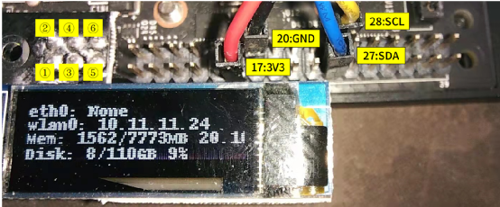 1.使用上图中间(2 号)的国产 PiOLED 显示屏,线路上不需要做任何调整,按照标准方式插上 Jetson 设备的 1~6 引脚位置,如下图左;